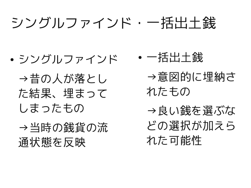 シングルファインドと一括出土銭の大きな違いは、シングルファインドは昔の人々が使用していた銭貨を落としてしまったものなので、当時の銭貨の流通状態を示しているの対し、一括出土銭は埋める際に良い銭貨を選んで埋納されたなどの選択が加えられた可能性が高いという事です。