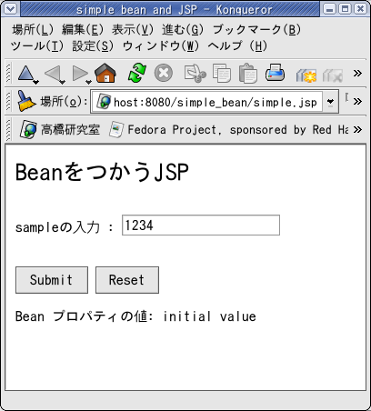 ブラウザでhttp://localhost:8080/simple_bean/simple.jspにアクセスします。