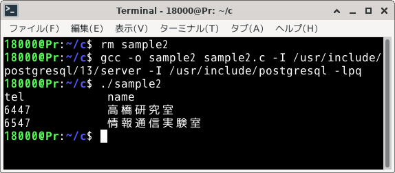 コンパイルオプションとしてsample2.c中の"libpq-fe.h"を使用するためのインクルードパス(/usr/include/postgresql)、PQ....関数を使用するためのインクルードパス(/usr/include/postgresql/13/server)、ライブラリ(-lpq)を指定する。